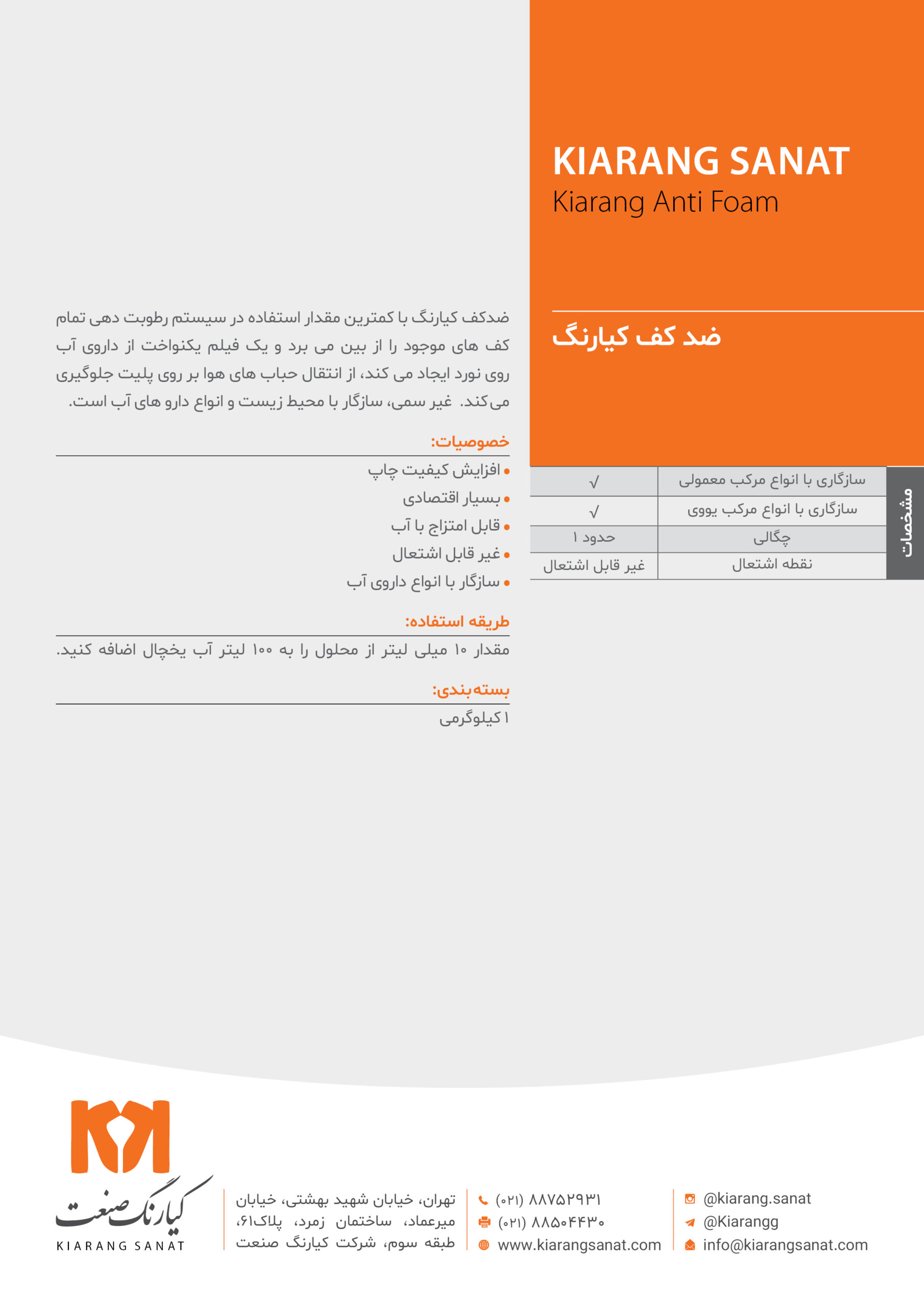 ضد کف کیارنگ صنعت جهت استفاده در صنعت چاپ تولید شده است. این ضد کف بر پایه سیلیکون است و قابليت رقیق سازی با آب را دارد.این محصول در محیط های اسیدی و بازی پایدار می باشد. قبل از استفاده از این محصول برگه اطلاعات فنی را مطالعه نمایید.