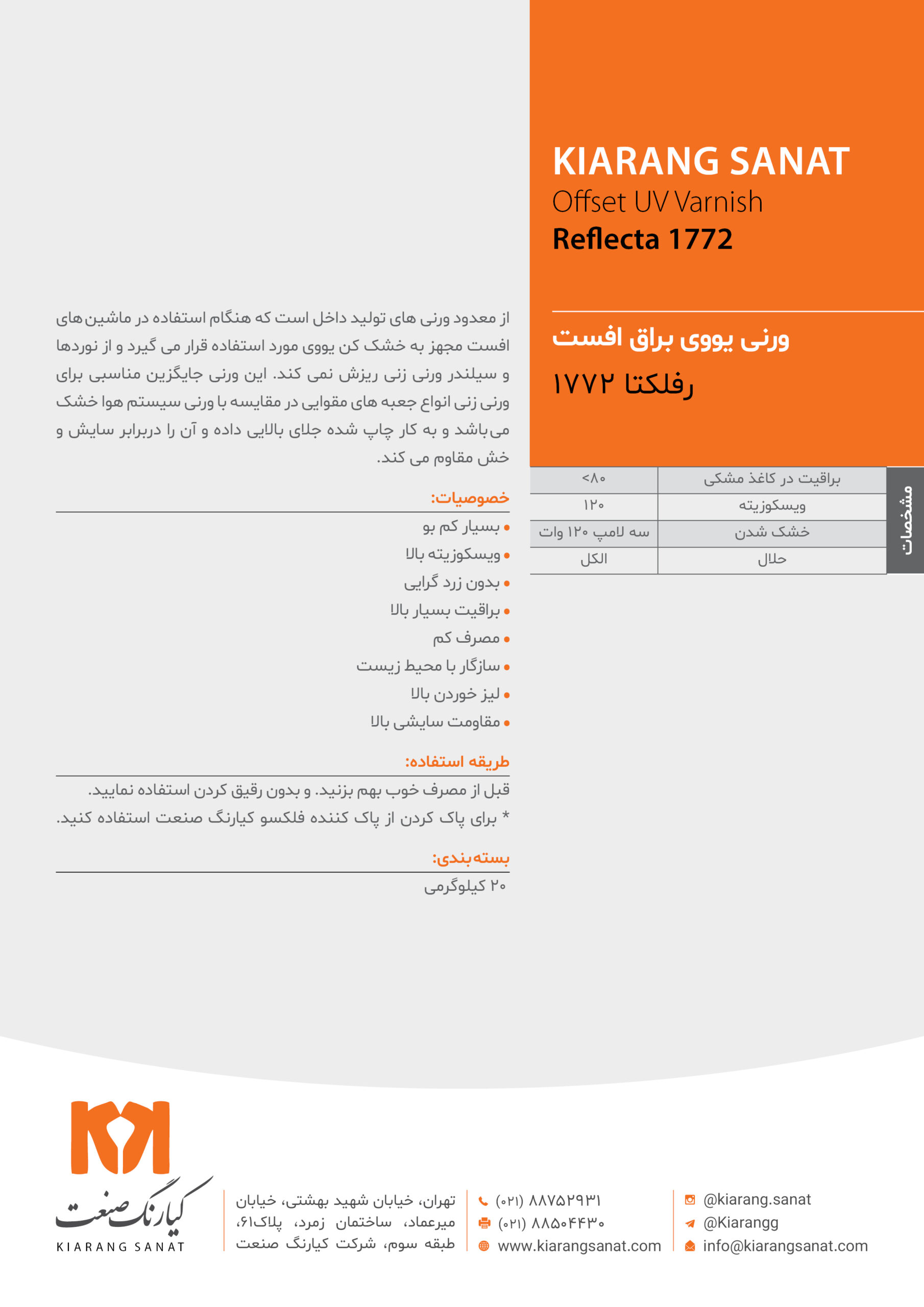 ورنی افست 1772 کیارنگ یک پوشش با براقیت فوق العاده و غلظت بالاست که برای استفاده در ماشین چاپ افست طراحی شده است و روی نورد ها شره نمی کند.